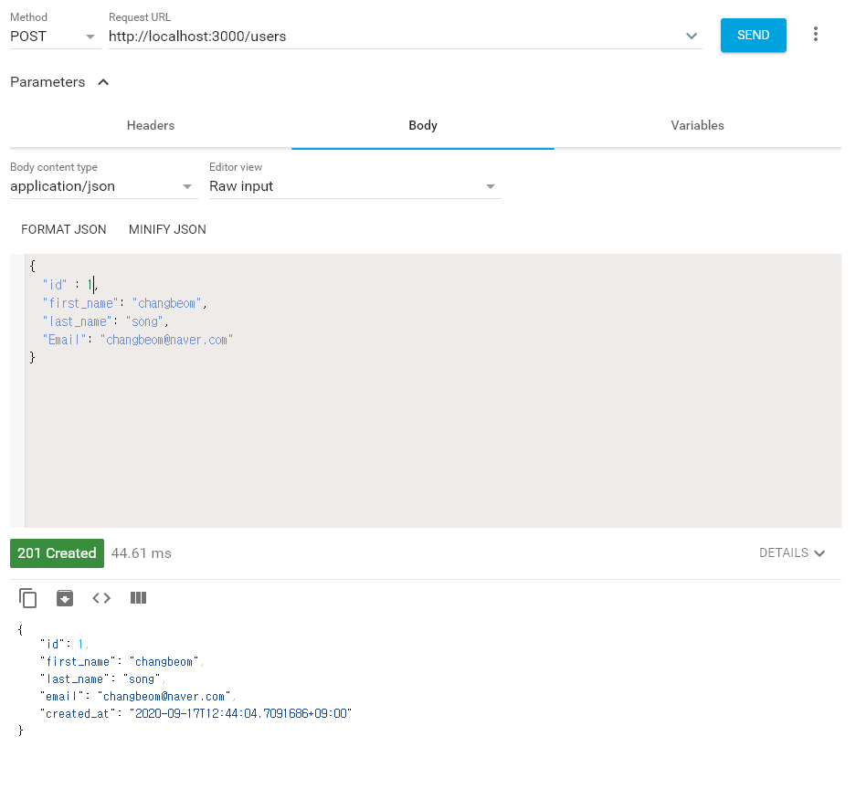 strings.NewReader(`{"first_name":"changbeom", "last_name":"song", "email":"changbeom2@naver.com"}`)) // 1