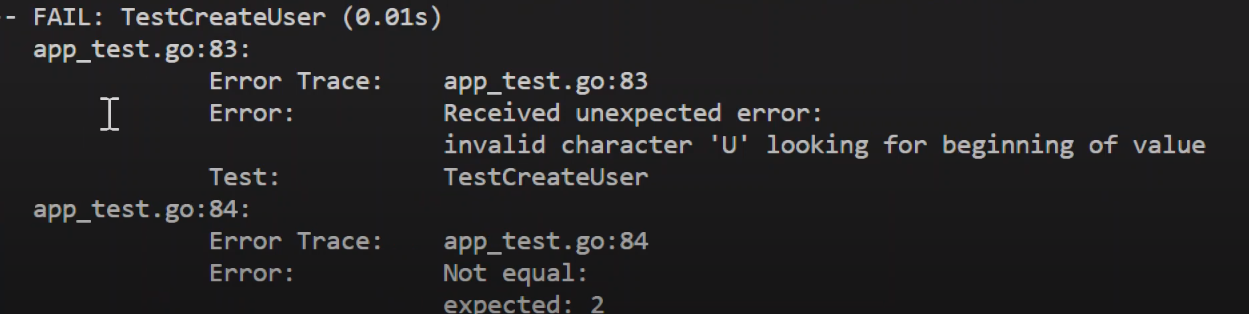 user와 user2는 사실상 같은 것이기 때문에 assert.Equal(user.ID, user2.ID) , assert.Equal(user.FirstName, user2.FirstName)를 사용하여 비교해주었습니다.