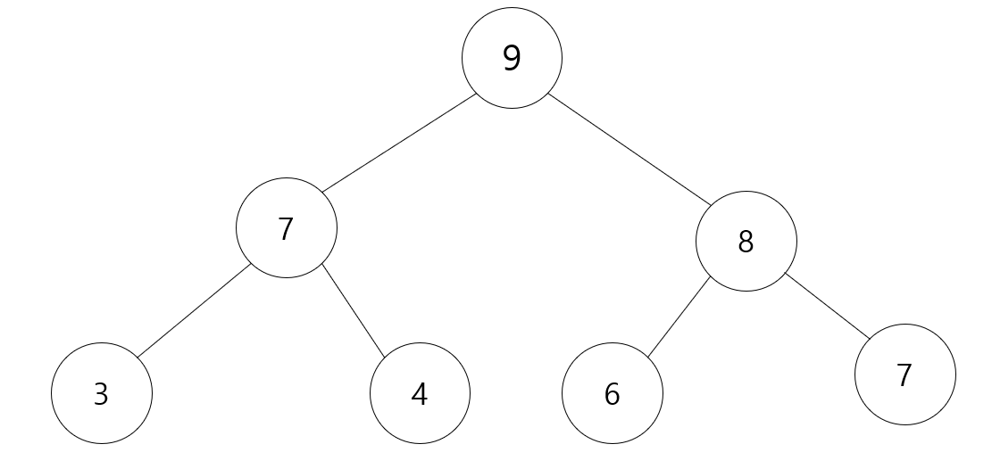 그러면 9는 Root Node인데 9가 가지고 있는 자식 Node는 7, 8이 되고, 7의 자식 Node는 3, 4이 되고, 8의 자식 Node는 6, 7이 됩니다.