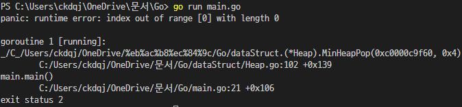 출력할 때 MinHeapPop을 하는데 이 갯수가 하나인데 MinHeapPop을 해서 list가 비어버리기 때문에 MinHeapPop()에서 자식Node를 맨 위로 올리는 과정이 있는데 그 자식Node가 없기 때문에 에러가 나게 되는 것입니다. MinHeapPop()코드를 수정해보죠!heap.go