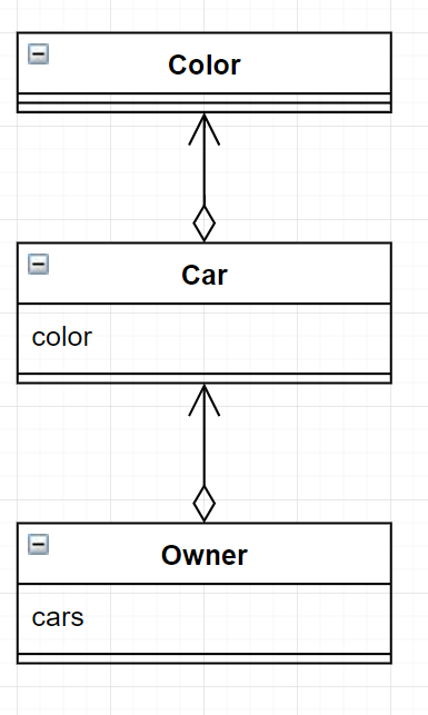 이 다이어그램에서는 Color, Car, Owner라는 세 클래스의 관계를 보여주고 있는데요.
