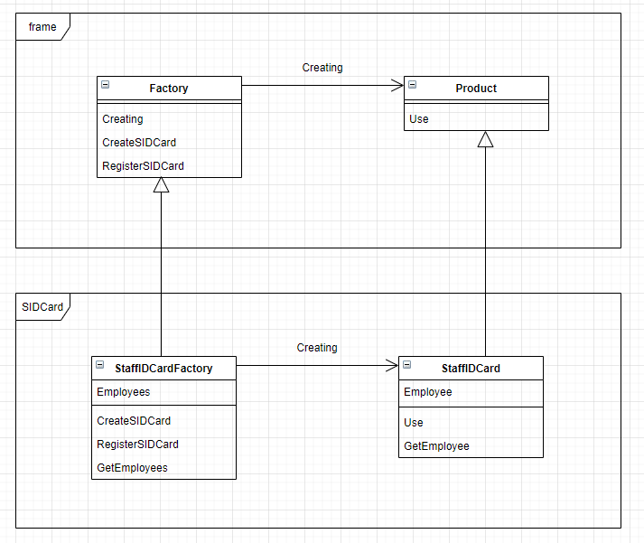 사원증을 만들고, 사원증을 등록하는 구현은 하위 메소드에서 수행하게 되는데요. 위 코드에 있는 framework에서 공장은 Creating메소드에서 Product의 인스턴스를 생성하는 것으로 규정하고 있는데요. Creating의 메소드는 CreateSIDCard 메소드에서 사원증을 만들어 RegisterSIDCard에서 등록하는 순서로 구현되고 있다고 이해하면 됩니다.