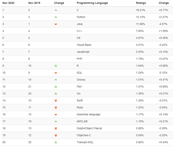 위의 항목과 일맥상통하는데 지금 보고 계신 것이 TIOBE Index라고 해서 프로그래밍 언어의 인기와 관련된 수치를 기반으로 프로그래밍 언어의 순위를 산정한 것입니다.