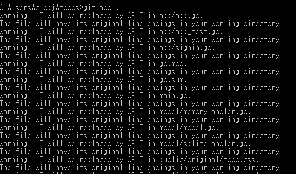 그 후 커밋을 위해 기존 파일에 있던 test.db파일과 bin폴더에 있는 todos.exe 파일들을 지워 줍니다.