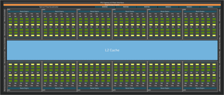 GB202는 AD102와 유사해 보이지만 8개의 TPC와 14개의 SM으로 구성된 더 넓은 GPC를 갖추고 있습니다(Ada의 경우 6개의 TPC와 12개의 SM). 이로 인해 AD102의 18,432개에서 증가한 24,576개의 최대 셰이더 수가 생성됩니다. GB202는 32GB의 GDDR7 메모리(16x 32비트 메모리 컨트롤러를 통해)와 쌍을 이룰 수 있는 512비트 버스를 갖추고 있습니다. 또한 L1 수준에서 캐시 누락을 처리하기 위해 최소 96MB의 L2 캐시가 포함됩니다. AD102는 표준 구성에서 24GB GDDR6X 메모리와 쌍을 이룰 수 있는 384비트 버스로 구성됩니다.